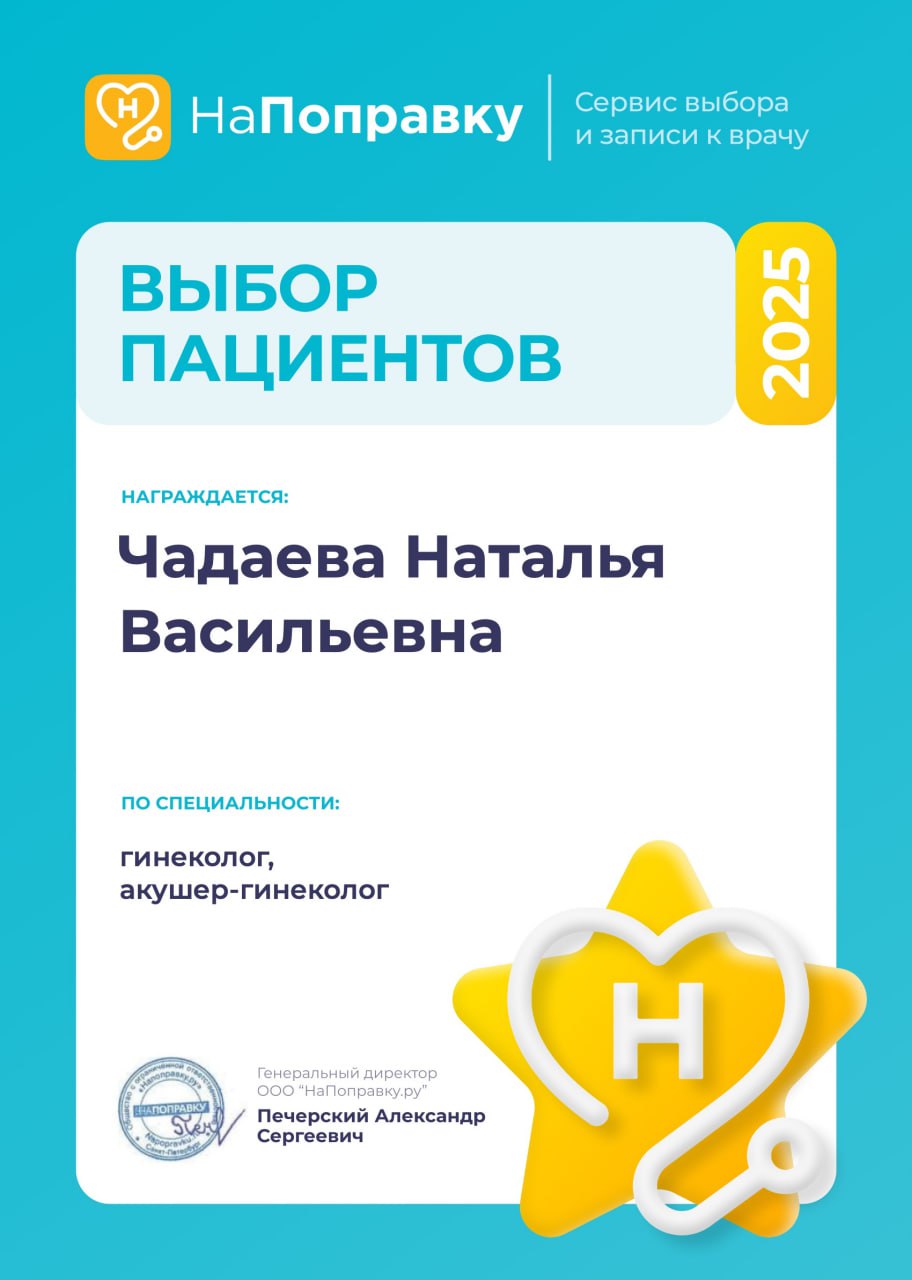 Грамотный специалист ..... В ПКМЦ я обратилась в связи с эрозией шейки матки и сопутствующей субcерозной миомой,попала к врачу Чадаевой Н.В. Сначала отнеслась с недоверием к предложенной врачом тактике (я сама медик), сделать кольпоскопию с биопсией и затем по результату лечить или же наблюдать за эрозией, так как была уверена, что прижигание необходимо в любом случае. В процессе обследования у меня также был обнаружен полип эндометрия,который, на деле,оказался субмукозной миомой, что удалось выяснить в результате РДВ, и плюс было сделано гистологическое заключение, что эндометрий в норме. Но , Чадаева Н.В, усомнилась в заключении т.к. клиническая картина болезни, ему не соответствовала. После перепроверки препарата(стекол) во Владимире, оказалось, что доктор права: никакой нормы у меня не было, а была железисто-кистозная гиперплазия эндометрия. Далее, мне была сделана еще одна операция по удалению субмукозной миомы, причем Чадаева Н.В. предоставила мне информацию, что в центре ,пациенты которые до этого уже делали оперативные вмешательства (в моей случае РДВ),могут попасть в квоту и значит сделать операцию бесплатно. В квоту я попала!!! Операцию провел Алексеев Д.Н.про которого я напишу отдельный отзыв. Затем Чадаевой Н.В было назначено лечение регулоном. После 4 месяцев приема у меня 1) Улучшилось состояние эндометрия, на последнем УЗИ гиперплазия не обнаружена 2) Значительно уменьшилась в размерах субсерозная миома с 2.5 см до 0.8мм. 3)Эрозия шейки практически зажила безо всяких манипуляций.....