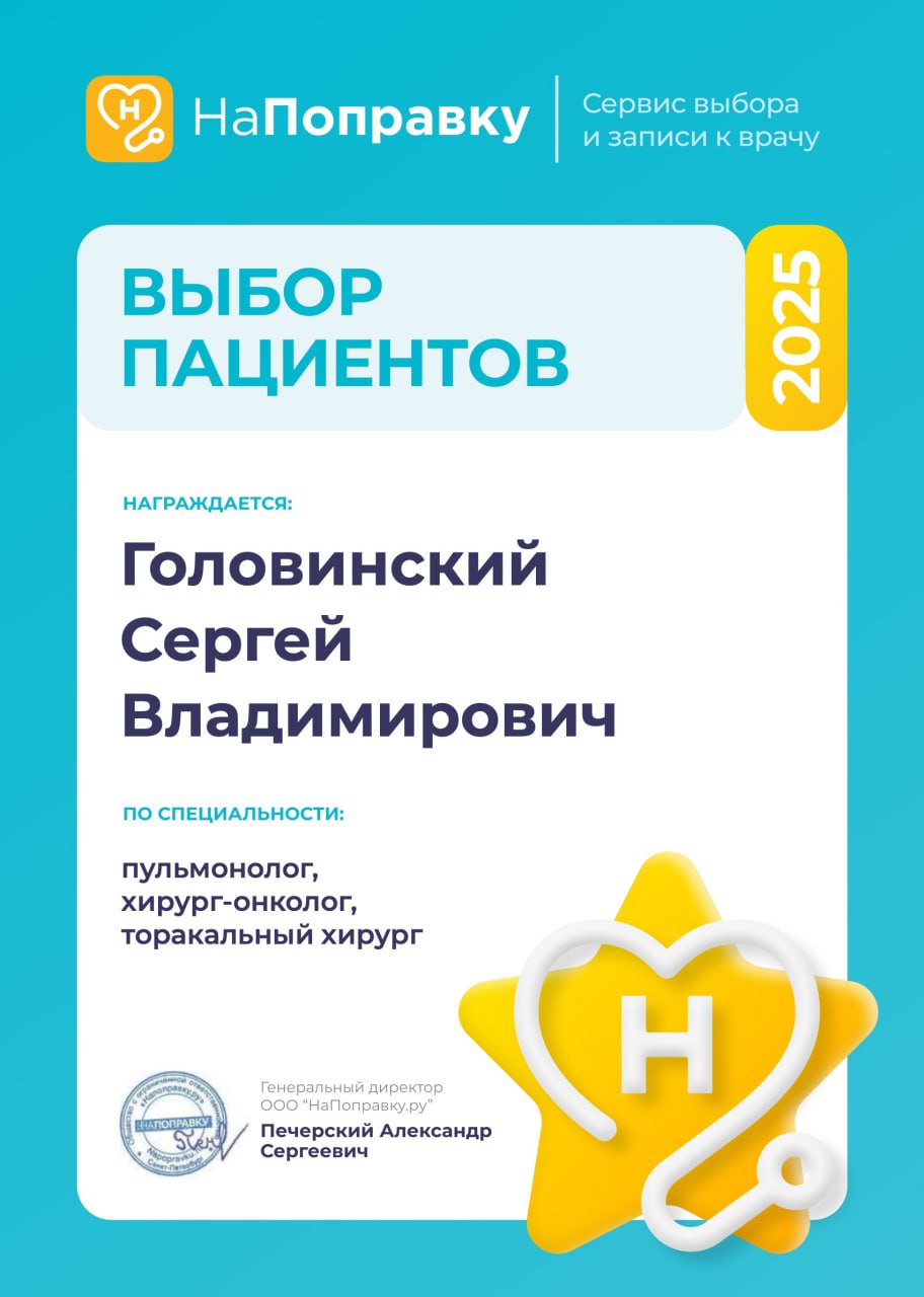 Головинский Сергей Владимирович — опытный врач-торакальный хирург и врач-онколог, с более чем 16-летним стажем работы, начиная с 2007 года.